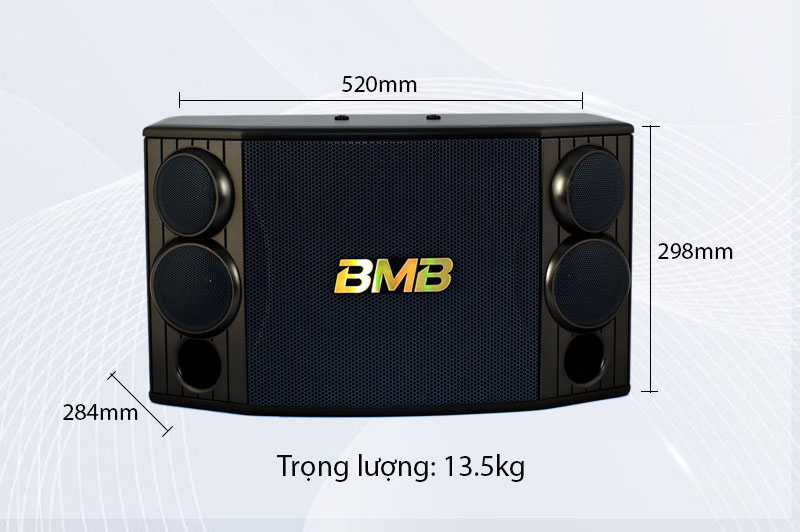 Điểm nổi bật đầu tiên khi nhìn vào loa là logo BMB được cắt dán 3D nổi bật, mang đến vẻ ngoại hình sang trọng với màu vàng ánh kim. Được thiết kế với tone màu đen với các góc cạnh vuông vắn càng làm tôn lên vẻ cứng cáp và mạnh mẽ. Có kích thước là 520(W)×298(H)×284(D) và trọng lượng là 13.5kg lên việc vận chuyển loa trở lên cực kỳ dễ dàng.