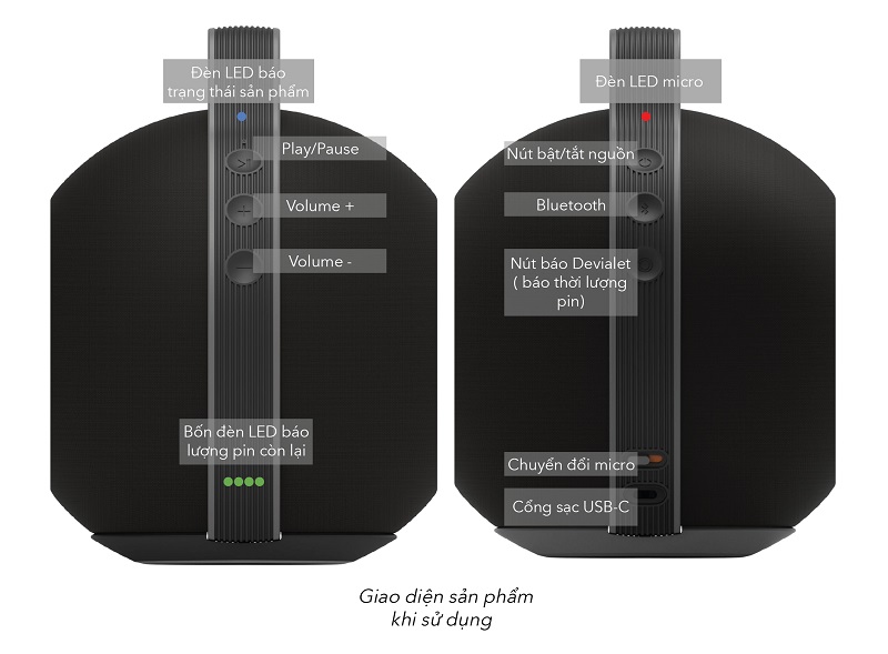 Một bên tay cầm là các nút PLAY/PAUSE để phát nhạc và tạm dừng. Nút VOLUME + và VOLUME- dành riêng cho việc điều chỉnh âm lượng. Phía tay cầm còn lại tích hợp nút ON / OFF để bật/tắt sản phẩm, nút BLUETOOTH để kích hoạt ghép nối Bluetooth và nút DEVIALET để truy cập tình trạng pin qua dãy bốn đèn LED.
