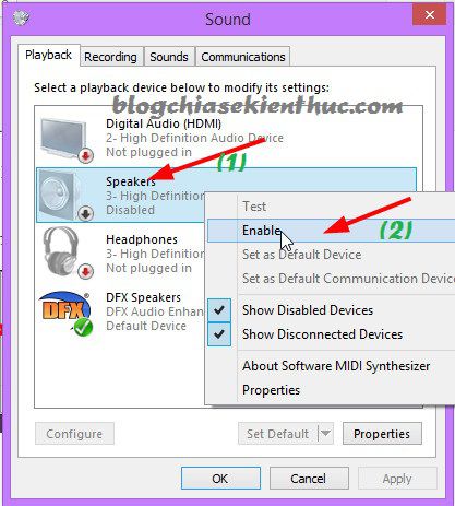 Thao tác bấm chuột phải vào biểu tượng âm lượng một lần nữa và chọn Playback devices. Phải đảm bảo rằng thiết bị âm thanh của bạn có một dấu kiểm tra màu xanh bên cạnh nó. Sau đó, bạn bấm vào Properties và chọn chế độ Use this device (enable), cách này chỉ áp dụng với trường hợp laptop có loa ngoài không kêu nhưng cắm tai nghe theo đường line out và sử dụng thì thiết bị vẫn có tiếng.