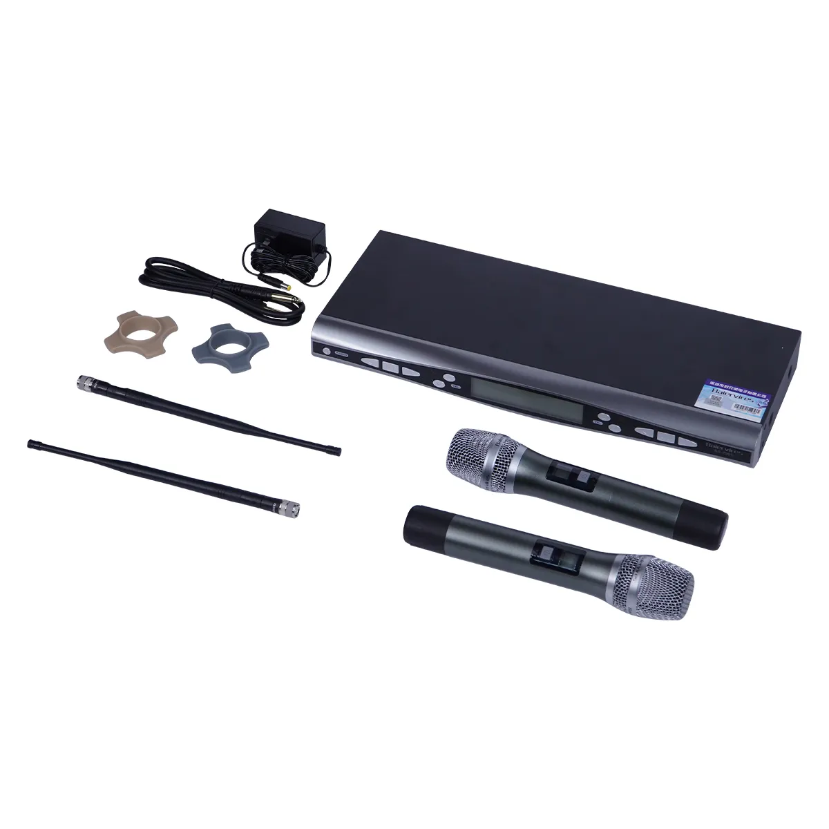 - Bộ micro gồm 1 đầu thu và 2 micro không dây hiện đại.